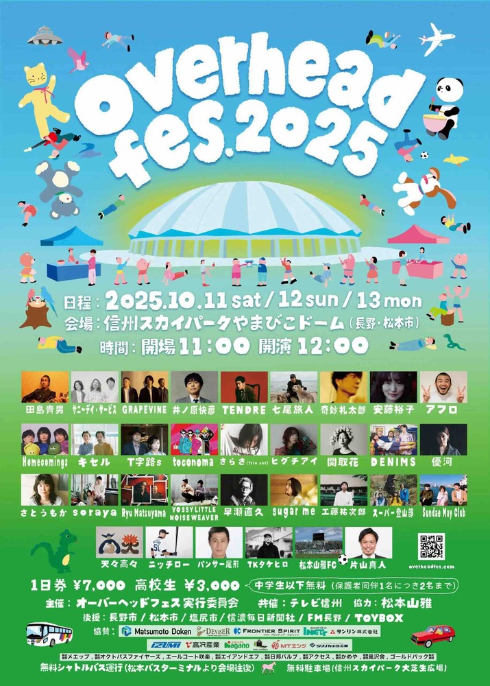 <公演情報> 『overhead fes’2025』 日時:10月11日(土)~13日(月・祝) 12:00 会場:信州スカイパーク やまびこドーム [10/11(土)出演] サニーデイ・サービス/ヒグチアイ/さらさ(Trio set)/アフロ/関取花/soraya/YOSSY LITTLE NOISE WEAVER/スーパー登山部/天々高々/井ノ原快彦/ニッチロー